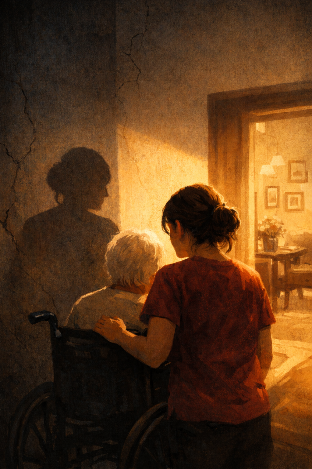 Aquí fálase do que pasa onde todo acontece: a noite, a medicación, a hixiene, a comida, a paciencia e o esgotamento… pero tamén os papeis, os tempos e as portas que ás veces non se abren.